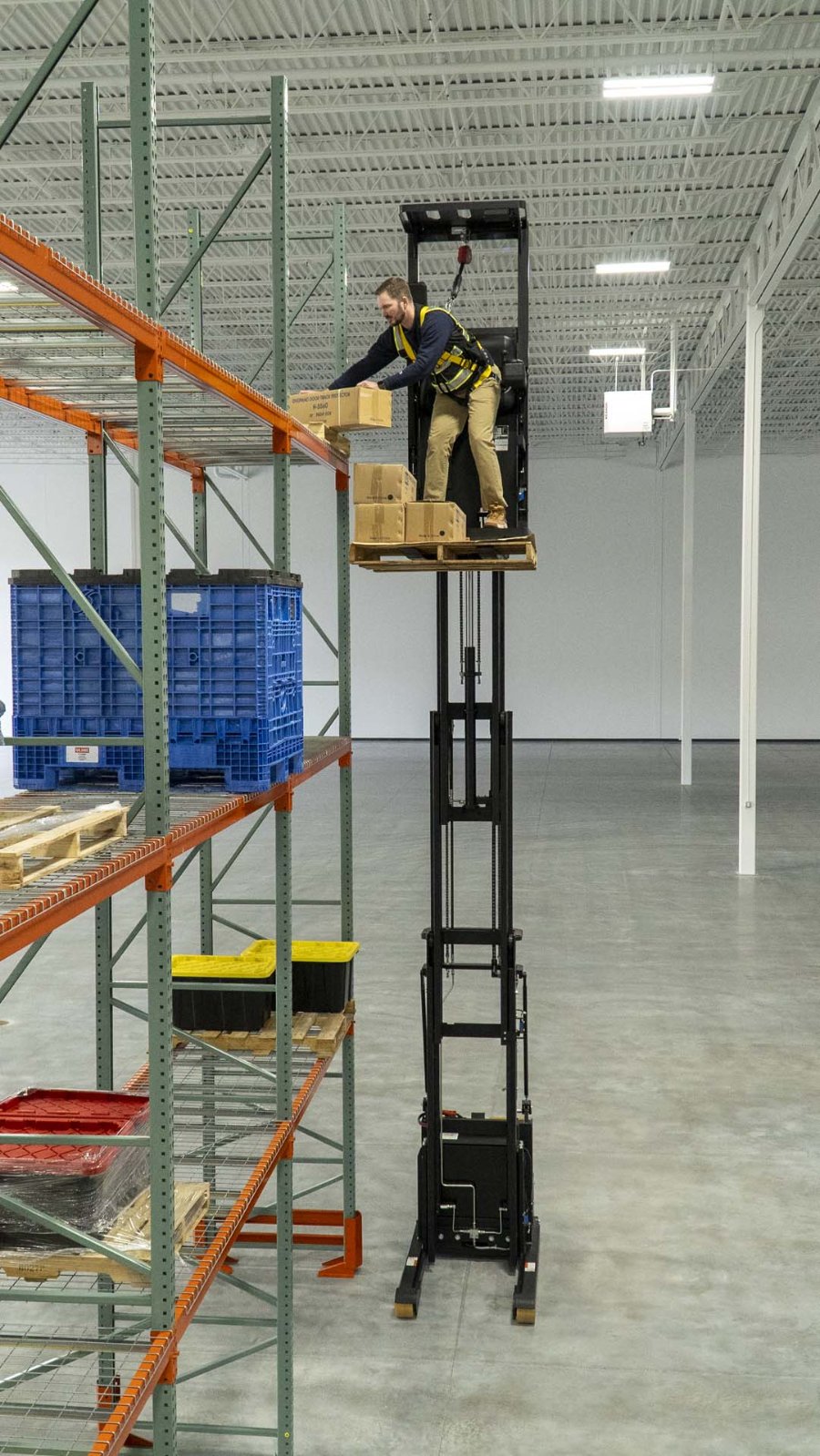 J2 Low Level Order Picker can be used to effectively order pick from low level locations and improve access to pick faces close to the floor. Travel is provided by a high efficiency AC drive motor on each unit that can be programmed through the onboard LCD dash. Power comes from a 340AH industrial battery or 224AH AGM maintenance free battery pack that is an available option.