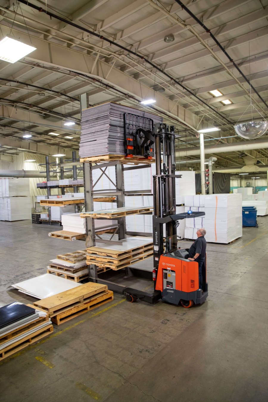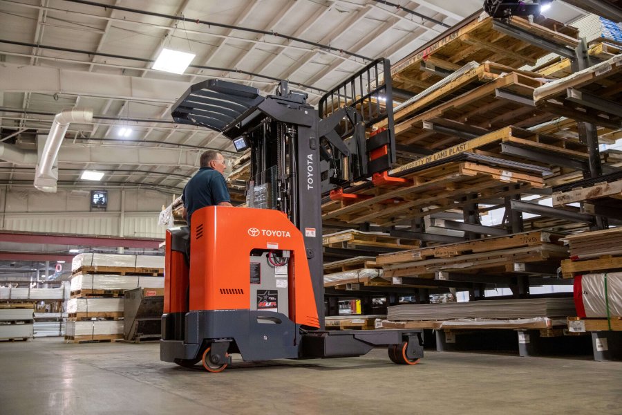 Toyota's Multidirectional Reach Truck is an innovative alternative to traditional material handling, specifically designed to handle wide, bulky loads. Articulating load wheels allow the forklift to travel horizontally, permitting compact travel and stacking wide loads in narrow aisles without the need to turn. The ability to travel both parallel or perpendicular to racking saves you time and space while increasing productivity.